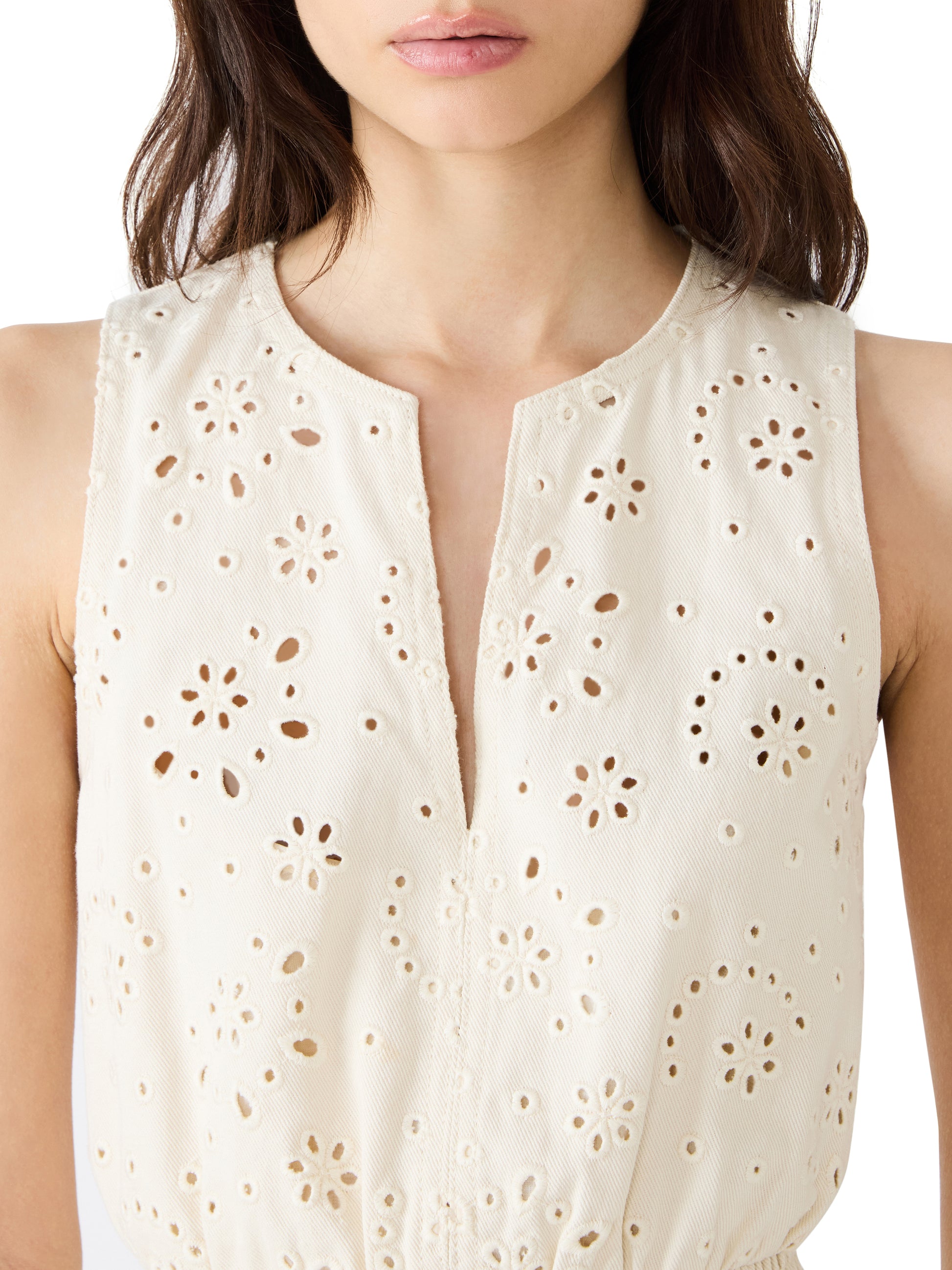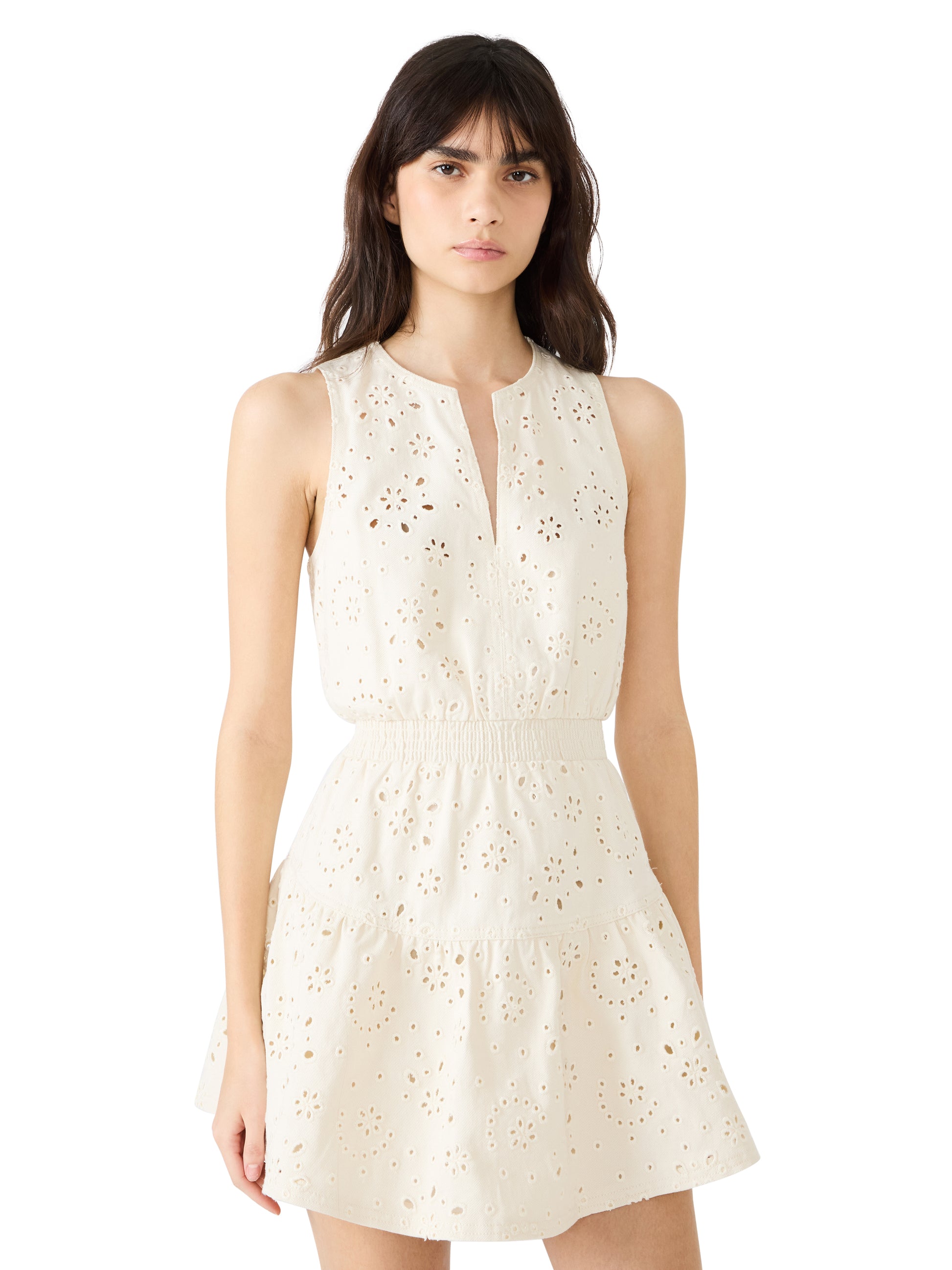 Effortless elegance meets everyday versatility in the Priscilia—a cream denim dress that transitions seamlessly from office to weekend. Sleeveless with a flattering V-neckline and elastic waist, this piece features delicate eyelette detailing and a charming tiered skirt that adds movement and dimension. Perfect for those who want one dress that does it all.